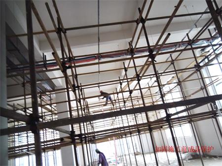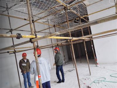 該房屋結(jié)構(gòu)為鋼筋混凝土框架-剪力墻結(jié)構(gòu),由于原二、三樓設(shè)備機(jī)房荷載增加,二樓局部不上人屋面增設(shè)多個(gè)大型空調(diào)外機(jī)導(dǎo)致原結(jié)構(gòu)梁、板承載力不能滿足功能使用要求而進(jìn)行局部加固改造,按加固圖紙?jiān)O(shè)計(jì)要求包括以下施工內(nèi)容:室內(nèi)安全措施支撐架搭設(shè)(含室內(nèi)成品構(gòu)件保護(hù)、局部硬防護(hù)、移動(dòng)活動(dòng)腳手架及鋼架管、安全網(wǎng)、密目網(wǎng)、安全警示標(biāo)志等其它措施);2~3層樓內(nèi)阻擋部份的建筑物拆除,同時(shí)進(jìn)行建筑垃圾清運(yùn);2~3層樓板底高強(qiáng)度碳纖維片材粘貼加固施工;2~3層樓板面高強(qiáng)度碳纖維片材粘貼加固施工;2~3層梁底高強(qiáng)度碳纖維片材粘貼加固施工;2~3層梁頂粘貼鋼板加固施工(包含化學(xué)錨栓植筋分項(xiàng)工程);2~3層梁、板加固部位表面水泥砂漿抹灰施工;屋面變形縫施工;屋面卷材防水施工;屋面剛性層施工;加固范圍內(nèi)原有管道、機(jī)電設(shè)備等相關(guān)線路管網(wǎng)成品保護(hù)